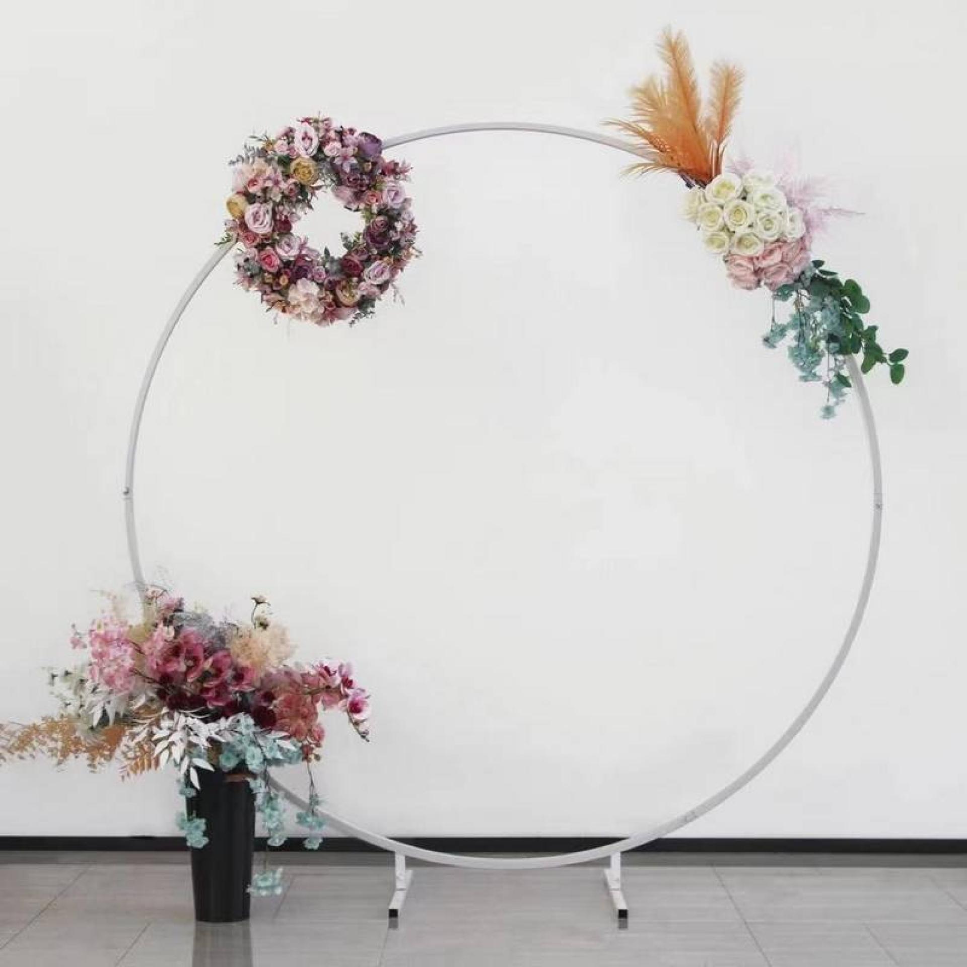 Vous souhaitez apporter une dimension chic et originale à votre décoration de mariage ? Cette arche circulaire est un choix parfait. Personnalisez-la selon vos envies avec des fleurs fraîches, des voilages ou encore des guirlandes lumineuses pour l’adapter à votre thème et créer un cadre enchanteur.